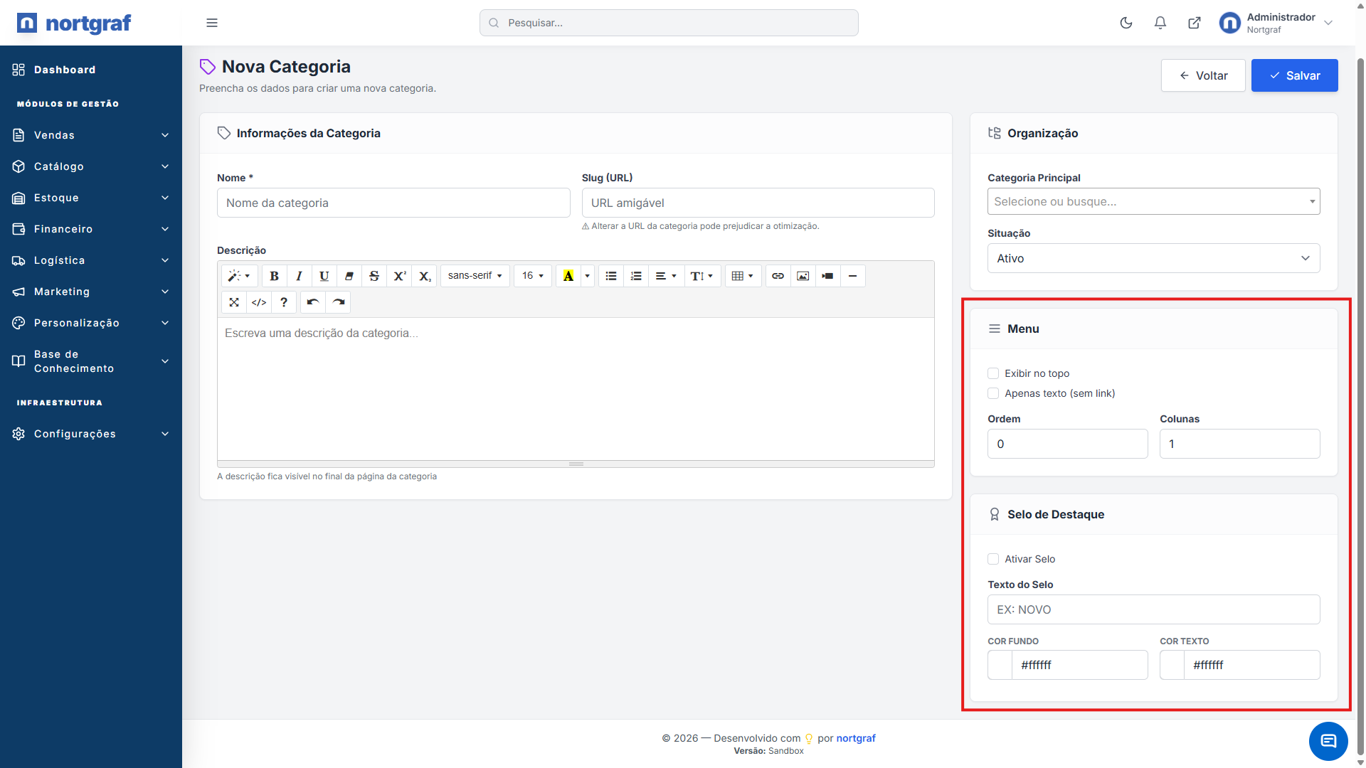 Categorias bem definidas não apenas organizam o catálogo, mas também controlam a exibição no menu e ajudam no SEO da loja. O formulário centraliza tudo: desde a identificação básica até regras de exibição e selos de destaque.