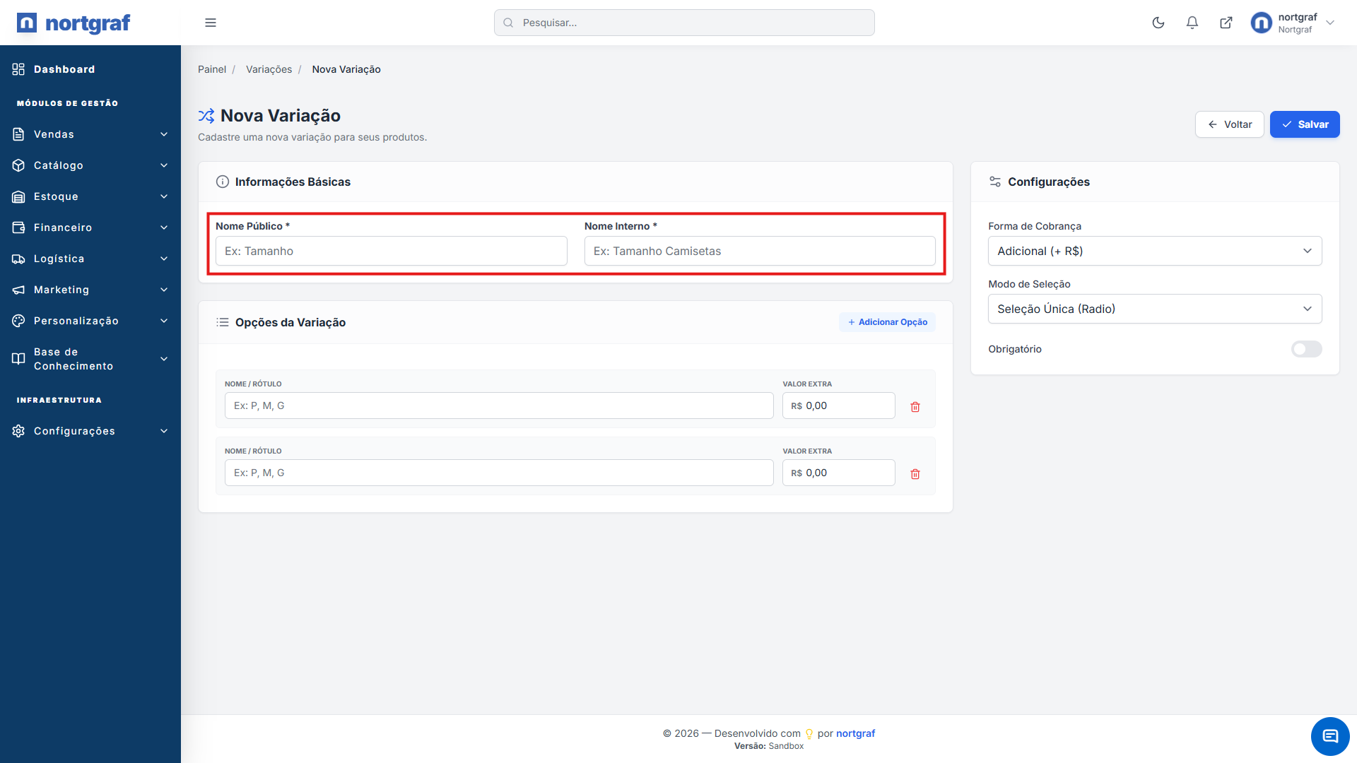 - • Nomes: Use o Nome Público para o cliente (ex: "Escolha o Tamanho") e o Nome Interno para organizar sua equipe (ex: "Tamanhos Camisetas 2024”).