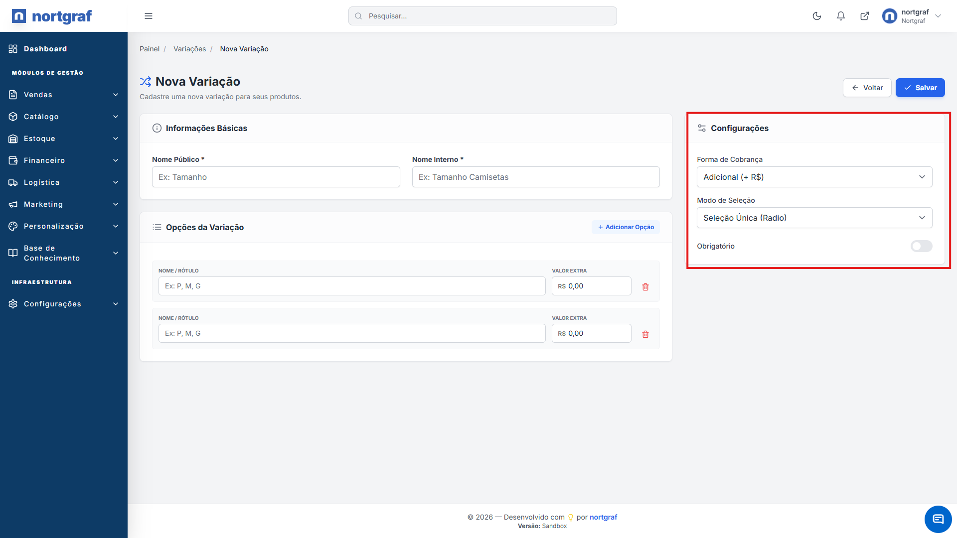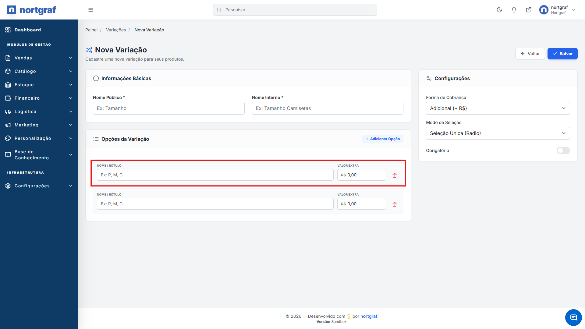 05Salvar: Conclua o cadastro. Agora a variação estará disponível para ser selecionada dentro do formulário de qualquer produto.