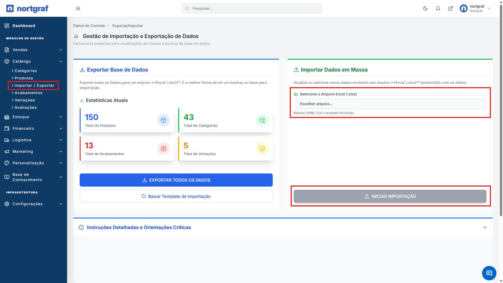04Upload: Na área de importação, selecione seu arquivo (.xlsx/.xls) e clique em Iniciar Importação. Aguarde a barra de progresso.