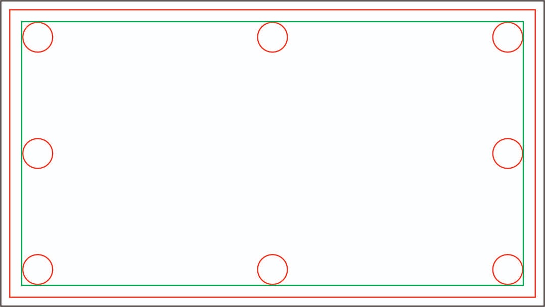 Os furos devem ser colocados nos quatro cantos e no centro das bordas superiores e inferiores do cartão. Cada furo deve manter uma margem de 0,6 cm em relação à linha de corte, essencial para preservar a estrutura do material.